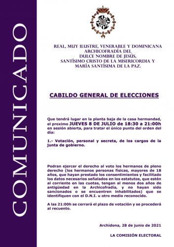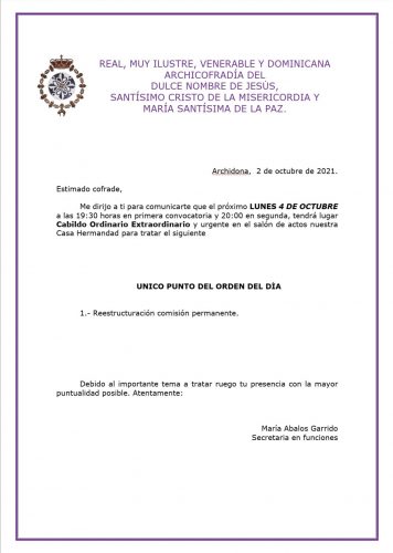 A continuación dejamos la convocatoria y el orden del día para el Cabildo de la Ascensión que tendrá lugar (D.m.) el próximo sábado 22 del presente mes.