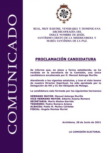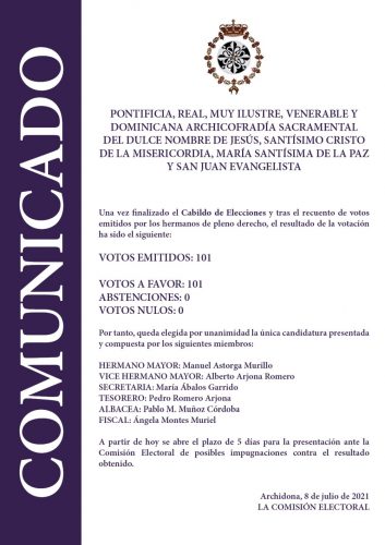 El próximo sábado día 22 de este mes tendrá lugar la Solemne Función a nuestra Titular mariana, la Stma. Virgen de la Paz. A las 20:00h. en la Iglesia de la Victoria, los hermanos de la Archicofradía del Dulce Nombre podrán asistir a la celebración eucarística recordando respetar las medidasSeguir leyendo